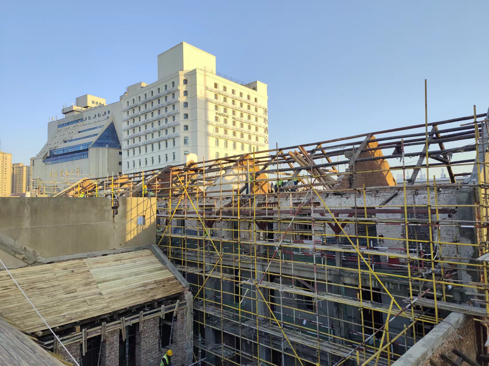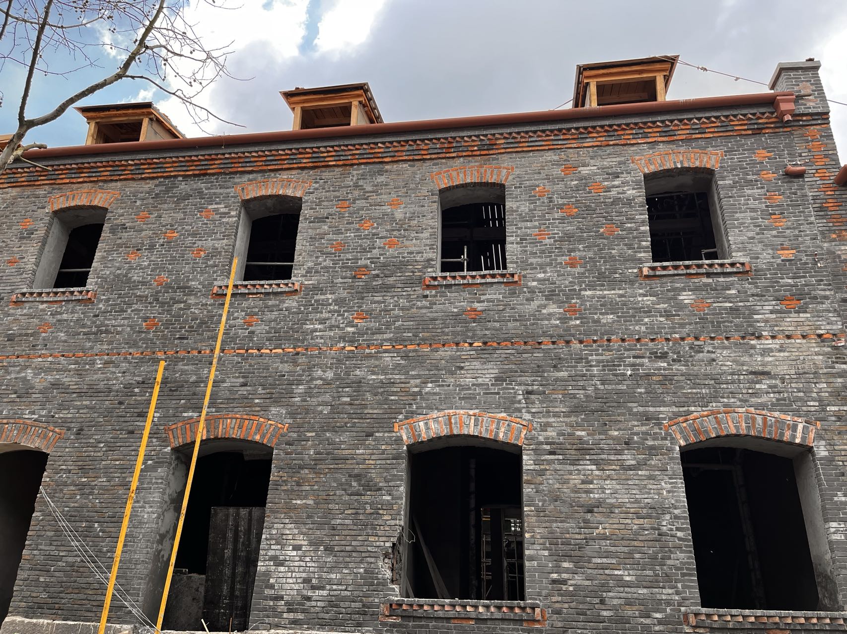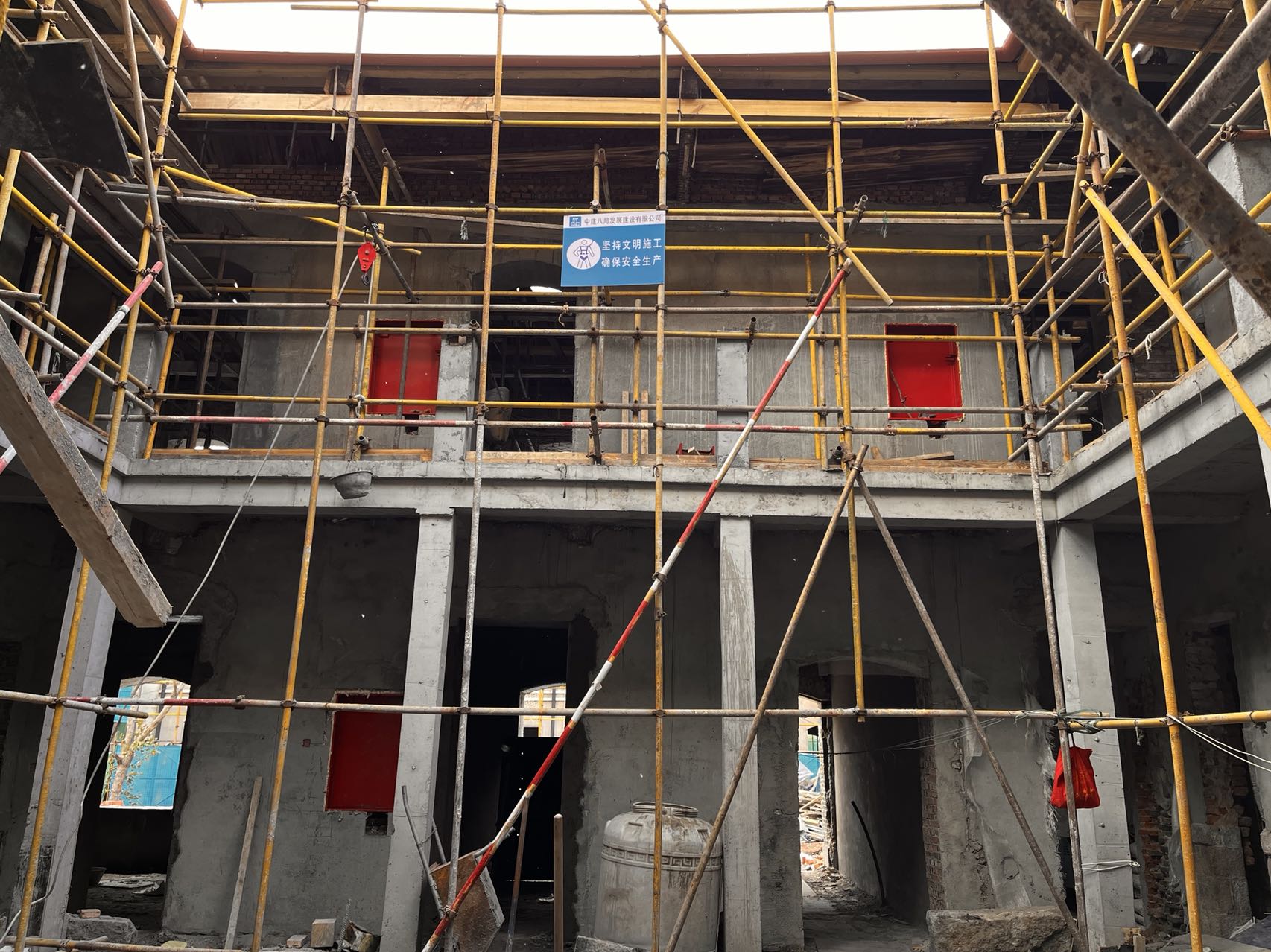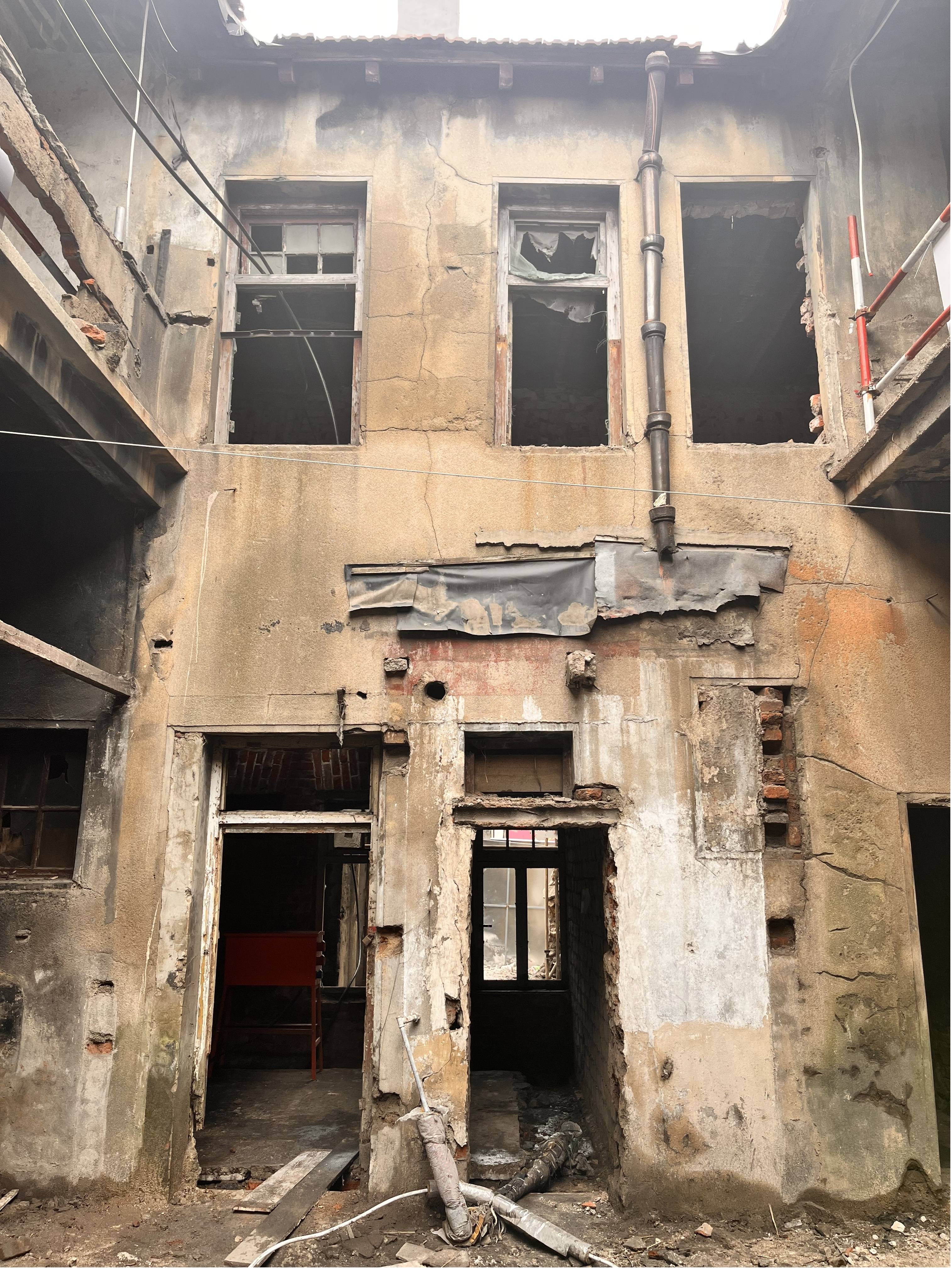 该项目位于青岛市即墨路24号,地上2层,局部三层,砖砌承重墙体、木梁木楼板及混凝土楼板混合结构,屋顶部分为人字木屋架结构体系。主要施工内容为拆除清理及院内脚手架搭设、墙面结构加固、院内连廊制作、屋顶结构加固、外墙修缮、石材处理、木作楼梯扶手修缮及安装等。项目原工程建设年代近百年,建筑为历史风貌建筑,修缮加固为保护建筑物原有风貌。