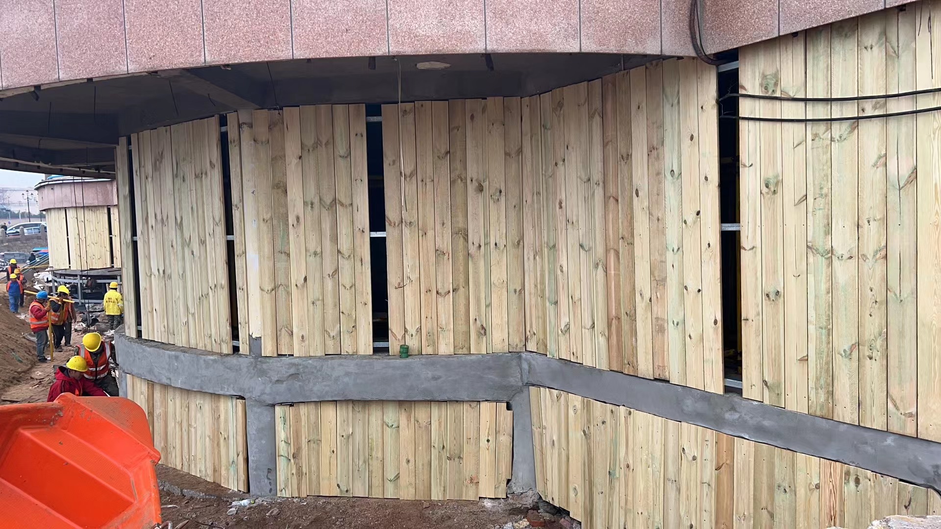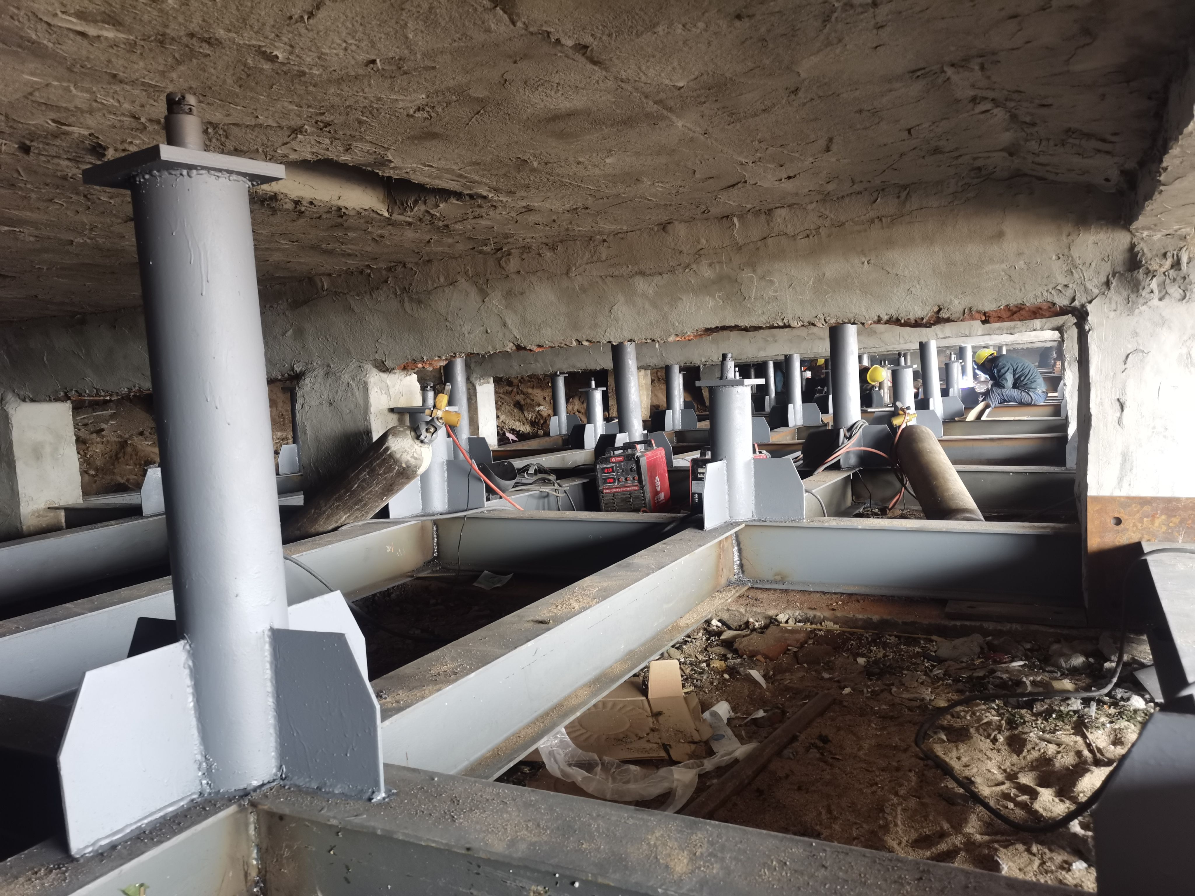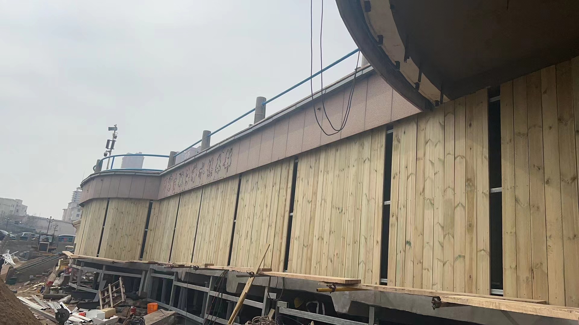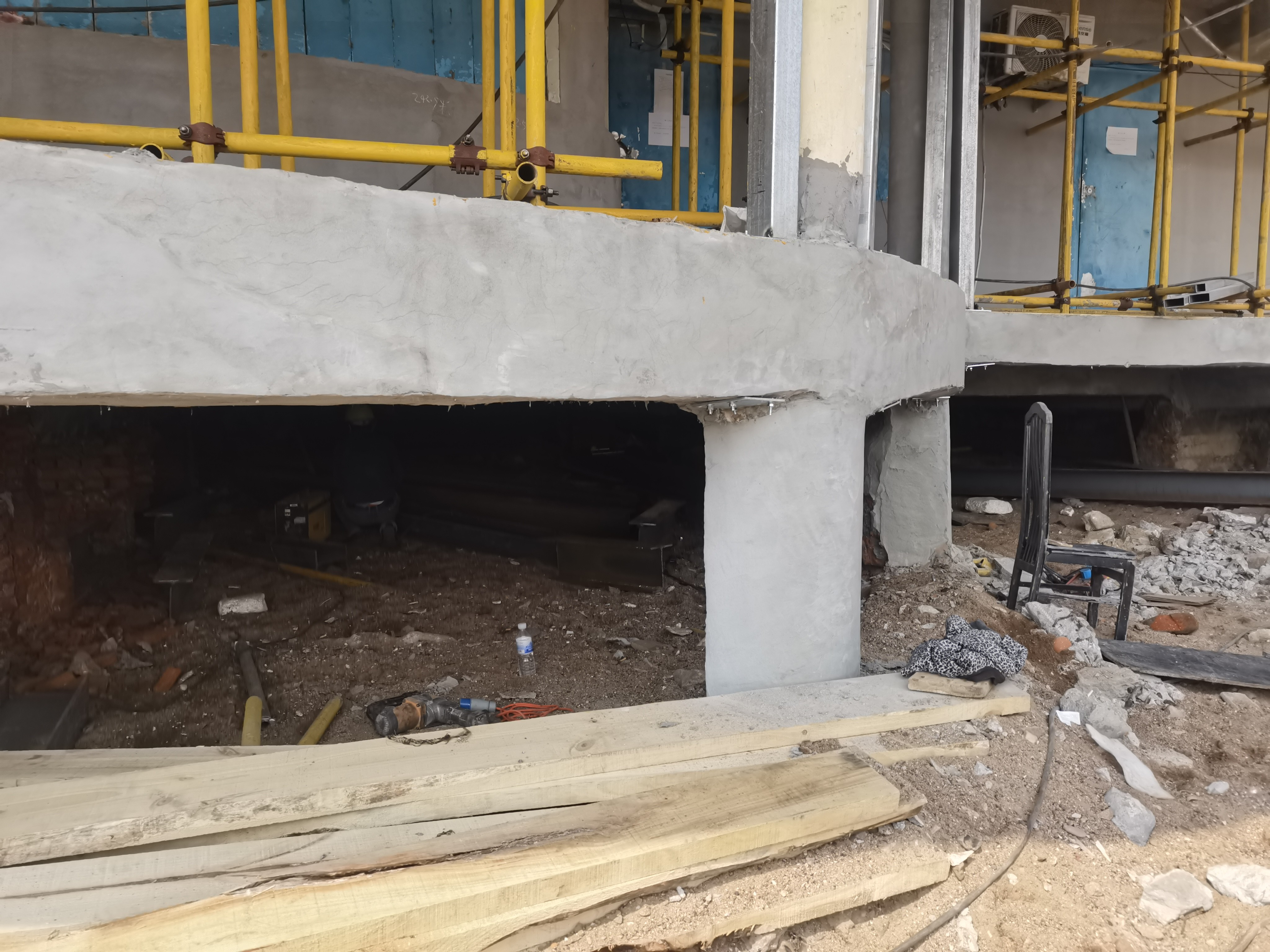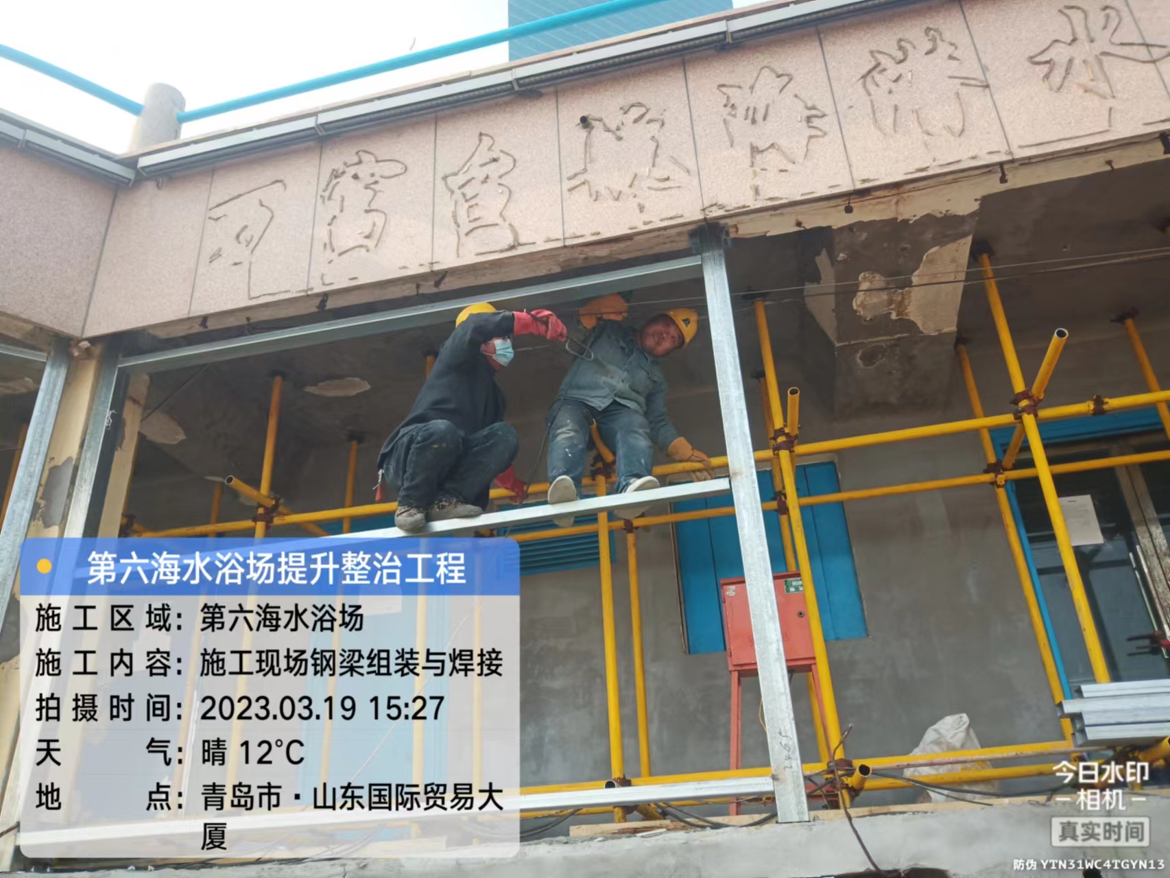 青岛市栈桥海水浴场 18-24 号更衣室位于青岛湾内,东临栈桥,西接海上皇宫,北邻青岛火车站,建筑面积约为 867㎡,为两层框架结构,经结构鉴定,房屋危险性评定等级为D级,承载力已不能满足安全使用要求,整体房屋处于危险状态。建筑物存在的主要问题:不均匀沉降安全隐患;承重构件多处出现老化和开裂,混凝土构件钢筋严重锈蚀,存在断裂现象,混凝土表面风化酥碱,构成多处危险隐患。因更衣室屋面(兼人行道)游客出行较多,结合项目现状,对本工程结构顶板、梁进行临时加固。